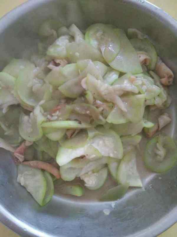 5. 加入角瓜:将切好的角瓜片放入锅中,与鱿鱼一起翻炒。